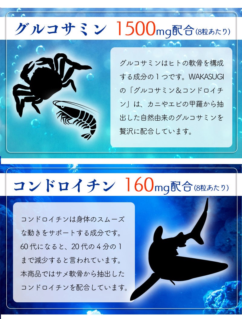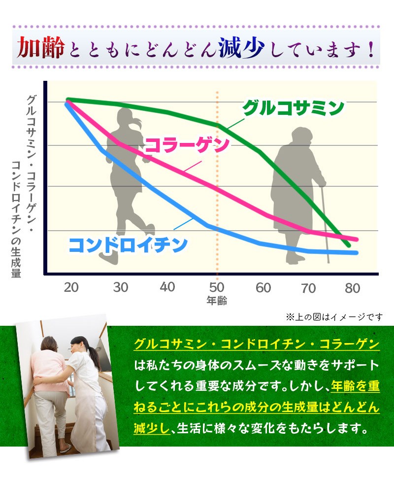 非変性2型コラーゲンもIN! 超高級成分「プロテオグリカン」新配合。 2型+非変性コラーゲンも5000μg→5192μgへUP。 【8粒当たり】グルコサミン1500mg、コンドロイチン160mg、2型コラーゲン5192μg配合! 濃縮高配合で健康&フシブシ対策しませんか? ■名称/グルコサミン含有食品 ■原材料名:グルコサミン(エビ・カニ由来)、セルロース、ショ糖脂肪酸エステル、微粒酸化ケイ素 / デキストリン、鮫軟骨抽出物、鶏軟骨抽出物、鮭鼻軟骨抽出物(プロテオグリカン、2型コラーゲン含有) ■内容量/180g (1粒300mg×600粒) ■保存方法/直射日光,高温多湿を避け冷暗所に保存してください。 ■賞味期限/ラベル下部に記載 製造から2年 【お召し上がり方】 1日5粒~8粒を目安に水,またはぬるま湯などでお召し上がりください。 【ご注意】 ◆体質に合わない方はご使用をお控えください。 ◆通院・入院中・薬を服用中・妊娠中の方は医師にご相談の上お召し上がりください。 ◆小児の手の届かない所に保管してください。 ◆自然食品の為、外覧上多少の違いや粒に斑点が見える場合がございますが品質に何ら問題ございません。 □区分/健康食品 □製造/日本 □販売者/株式会社 若杉エンタープライズ 0120-961-866 □広告文責/岐阜県岐阜市冨沢町38-8 |