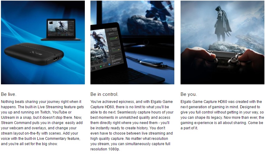 - One-click sharing to YouTube, Facebook and Twitter.Comes with: Elgato Game Capture HD60, USB cable, HDMI cable