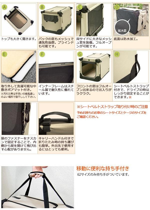 | アウトドアでの使用に最適な形状。通常のケンネルよりもソフトな分、軽量になっています。4方向メッシュ仕様で抜群の通気性を実現。底面は防水加工をしていますので、場所を選ばずにご使用いただけます。サッと組み立てられ、簡単に折り畳めるので、持ち運びや収納にも便利です。 |