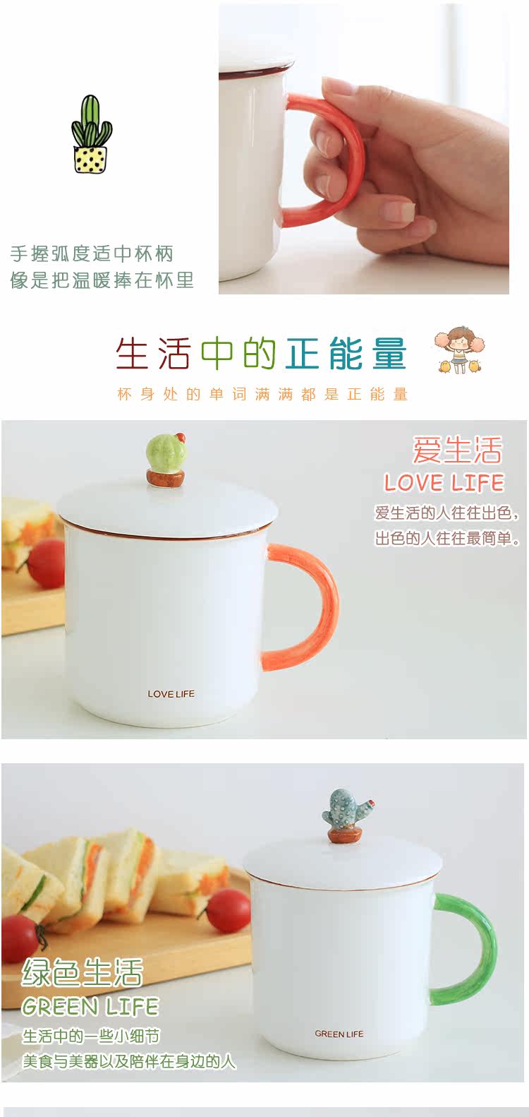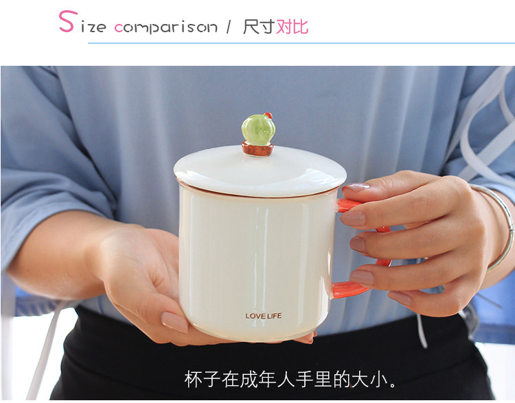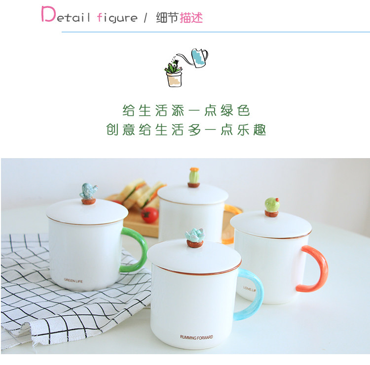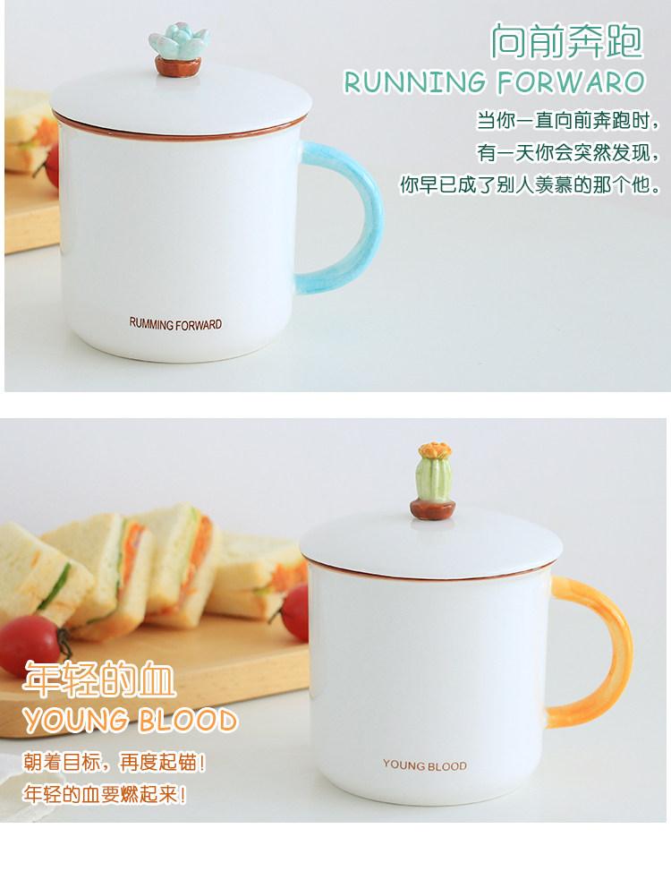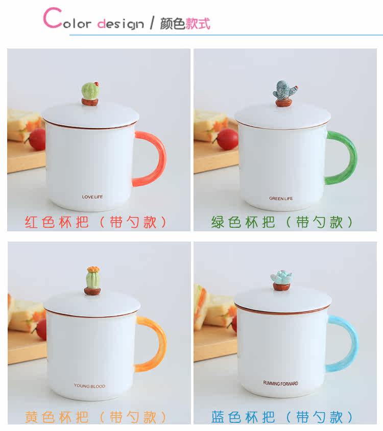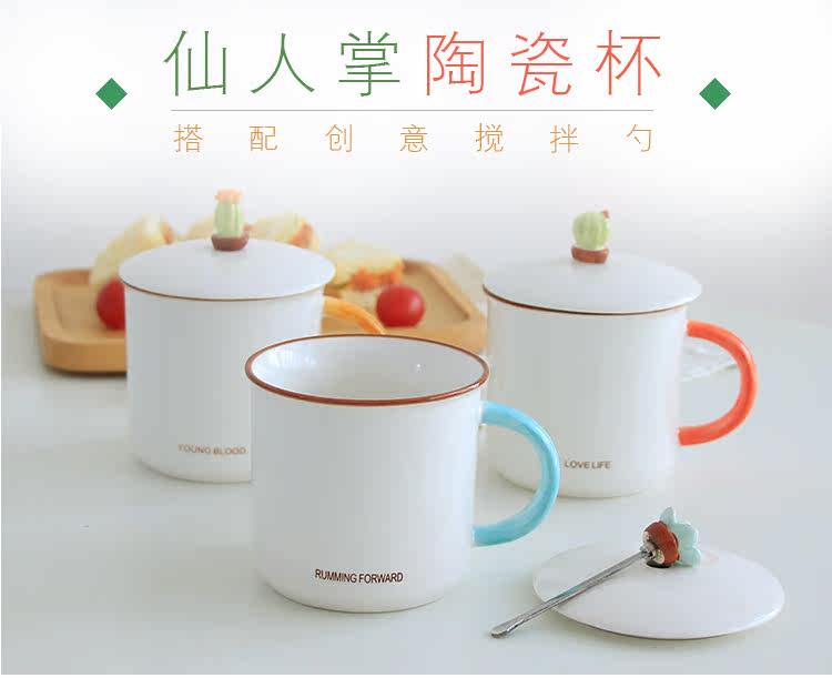 简约小清新仙人掌陶瓷水杯子带盖勺文艺情侣办公室牛奶麦片马克杯