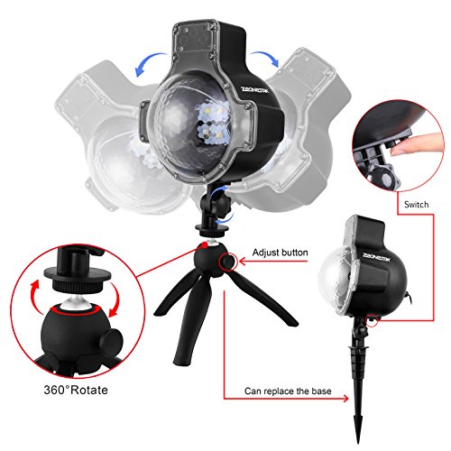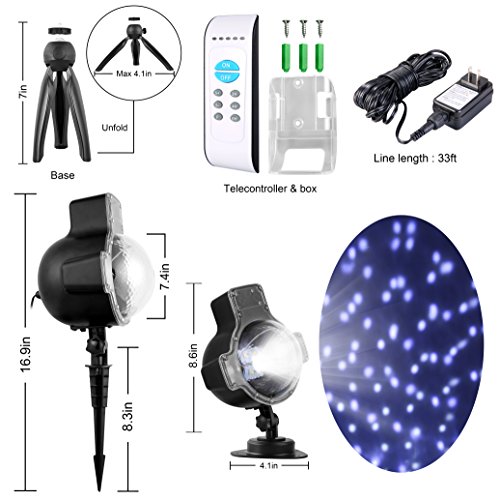 - Comes with two kind of base and a long spike as picture shown.The projection light can be satked into the ground.Also collocated with 360° adjustable base and fixed base, 180°adjustable projector head,it is quite convenient to aim the fairy light to the place where you want