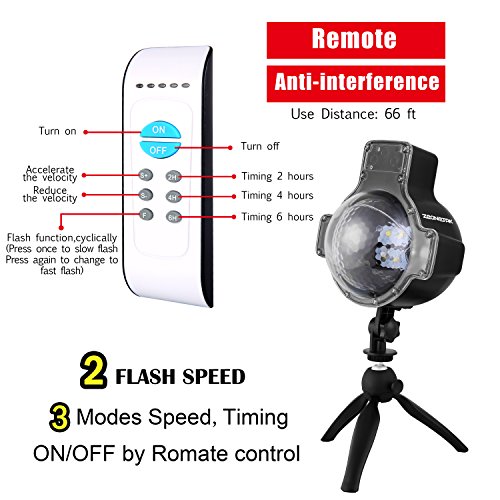 - Features a wireless remote to control the fast and slow moving speed,flash or not,on and off,6 hours automatically off function. Coverage area (15-50㎡/ 18-60 sq.yd) at the same spot distance (3-6 m/ 9.8-19.7 ft)