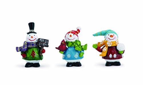 - Sold as a set of three (3) assorted snowman figurines; All bundled up in a sweater and scarf, they are holding a sign, cardinal, and snowball