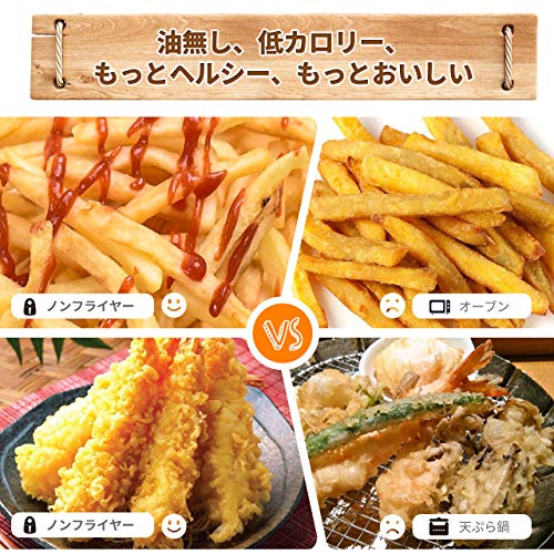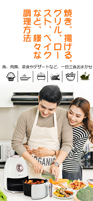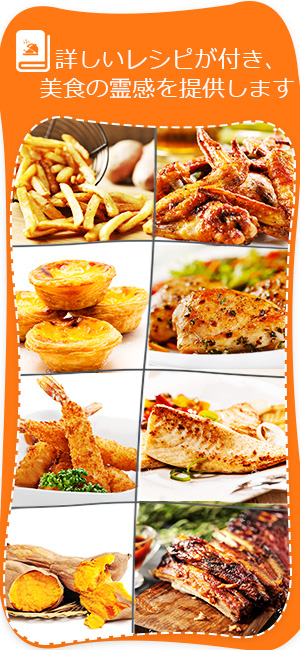 調理可能メニュー(例):揚げ物(エビフライ、から揚げ、天ぷら、揚げ豚肉餃子、さんまの塩焼き、唐揚げ、コロッケ)、オーブン&グリル(ローストビーフ、焼きサツマイモ、春巻き、タルトタタン、フライドポテト)、デザート(ケーキなど)