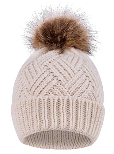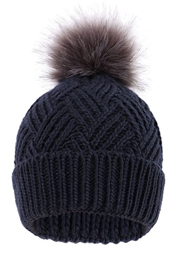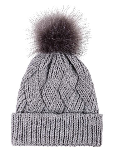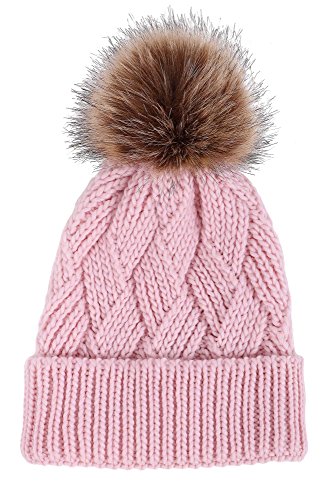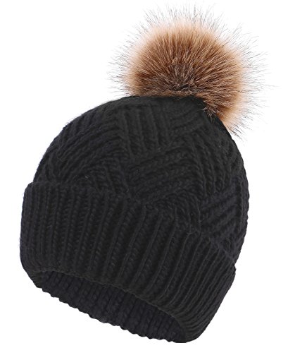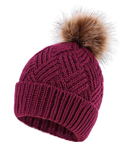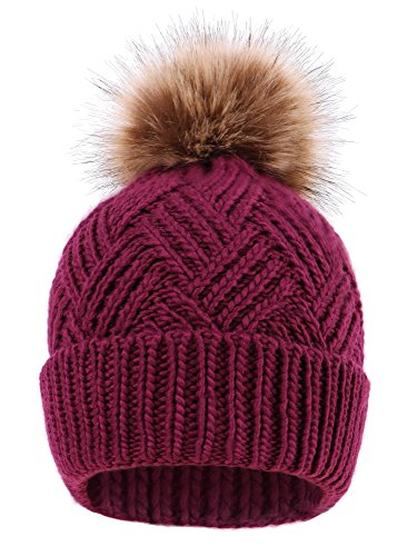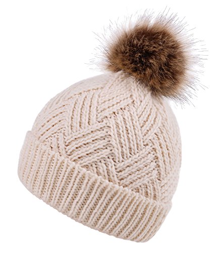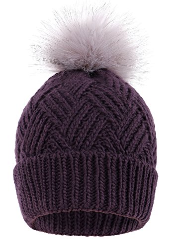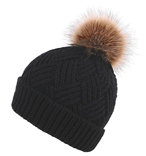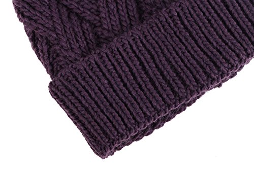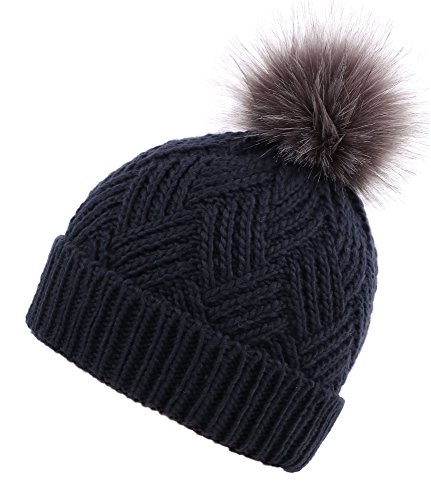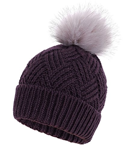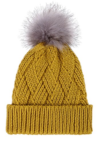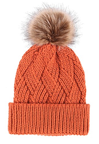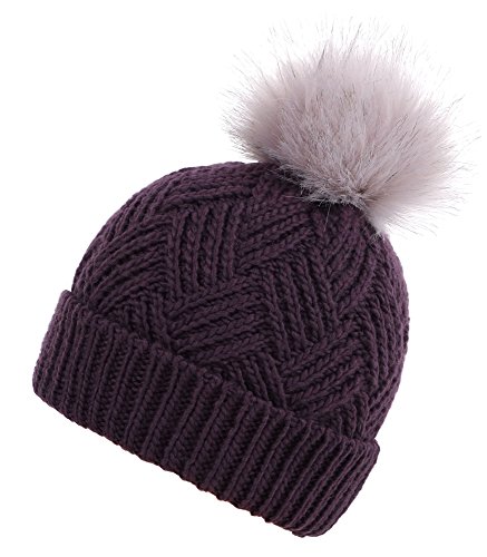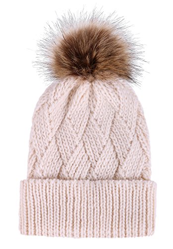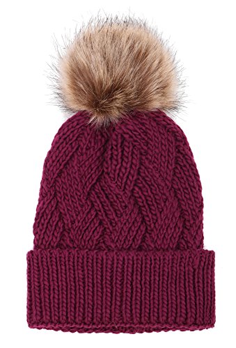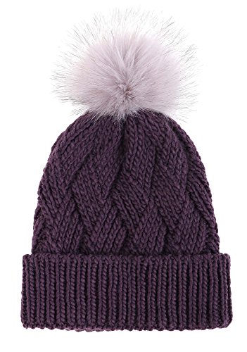 This delightfully cozy knit beanie features a whimsical faux fur pompom at the top, and a beautiful patterned cable knit, making it an excellent choice for braving chilly winter weather. Made of a stretchy, breathable acrylic blend in an ultra thick, dual layered chunky knit for unbeatable comfort and a perfect fit. Covers the ears for extra protection, and includes a foldable cuff that can be adjusted as desired. 0
