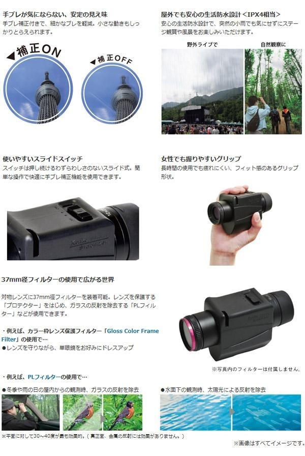 | 手ブレ補正機能付きで細かなブレを軽減をする単眼鏡。 |