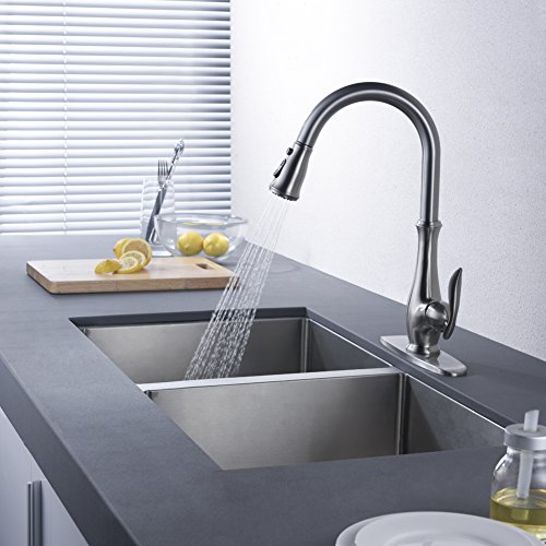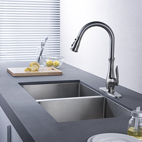 Easy to operate-----Single Handle Lever Design Provides You Precise Temperature and Volume Control, Flexible Pull Down Hose Retracting System Make Sprayer Head Precisely Back into Spout. High Arc 360 Degree Swivel Spout and Ultra Long Pull out Hose Extend More Space for Deep Pots and Pans Washing Access