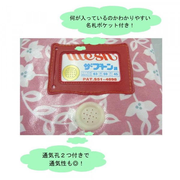 | 座布団約5枚を収納可能。通気孔2つがついているので、通気性もよく安心して大切な座布団を収納できます。 カラーは、ピンクとブルーの二色を取り扱っています。 |