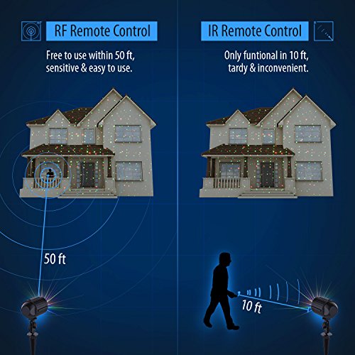- FR REMOTE CONTROL:Christmas Lights Projector has RF remote control, free to use within 15 meters,which is better than infrared.Remote control can be timed(2H,4H,8H), sensitive,power saving,and very easy to use.