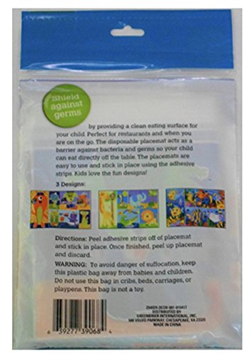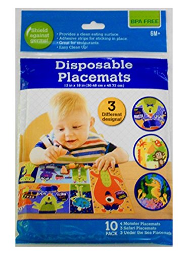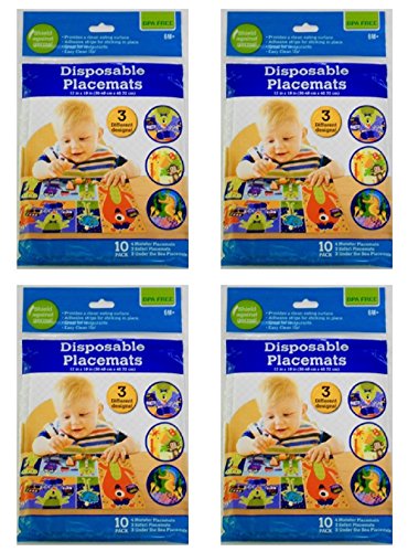 -. Feature : 40 Disposable placemats (4 packs of 10) / 3 different designs (Monster, Sea World and Jungle Safari) / Adhesive strips for sticking in place / Great for restaurants and travel / Easy clean up