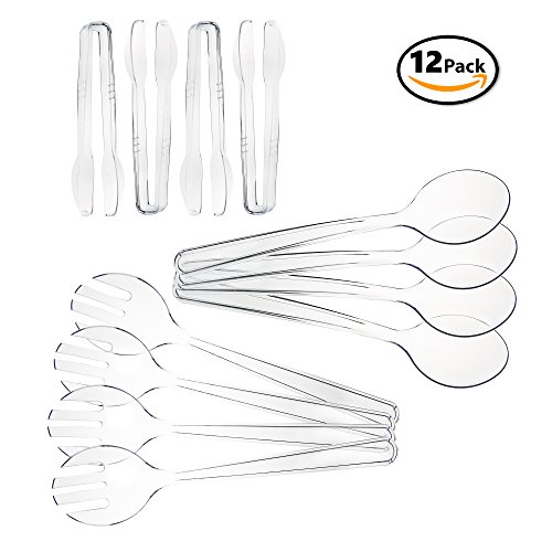 Set of 12 - Heavy Duty Disposable Plastic Serving Utensils, Four 10” Spoons and Forks, Four 6-1/2” Tongs, Clear