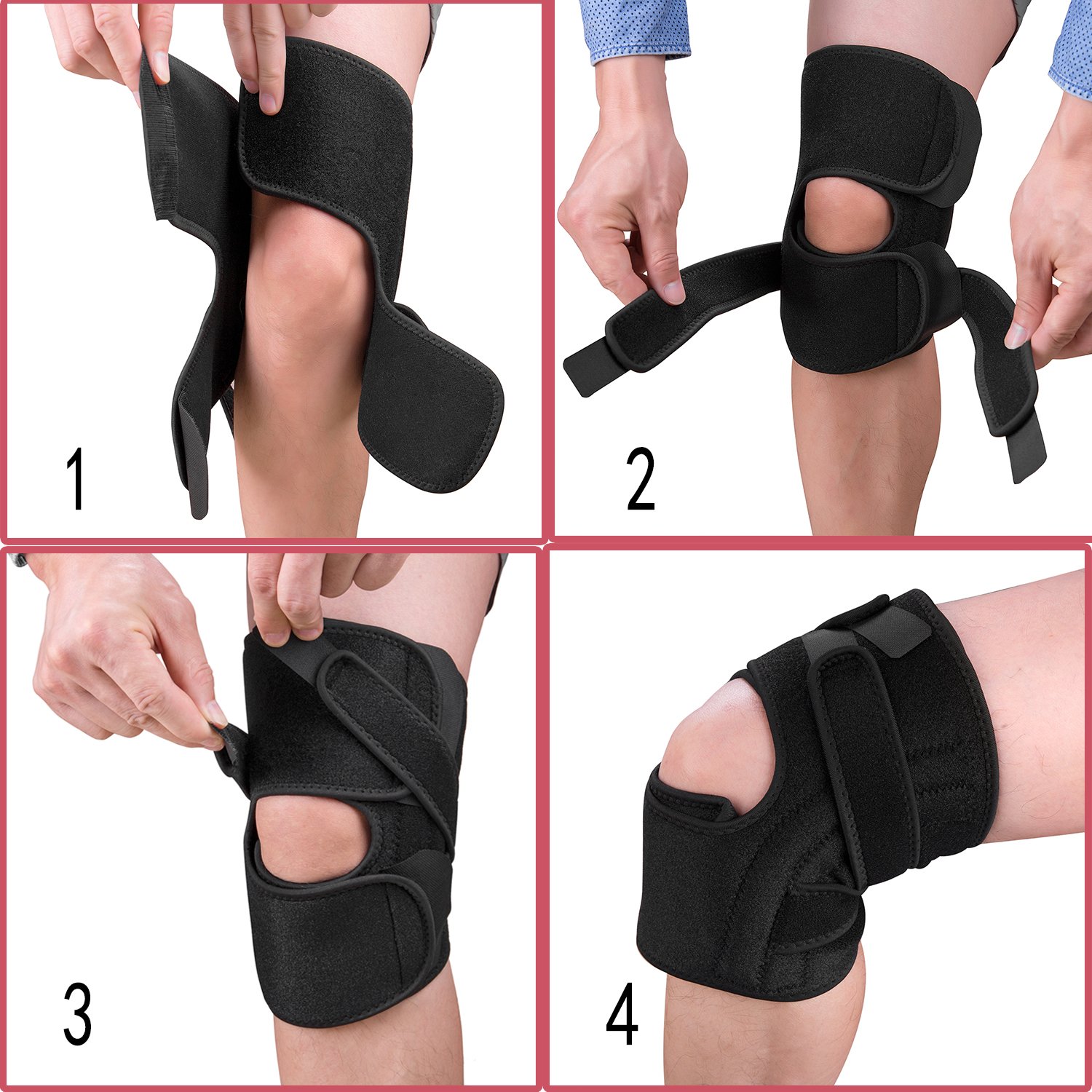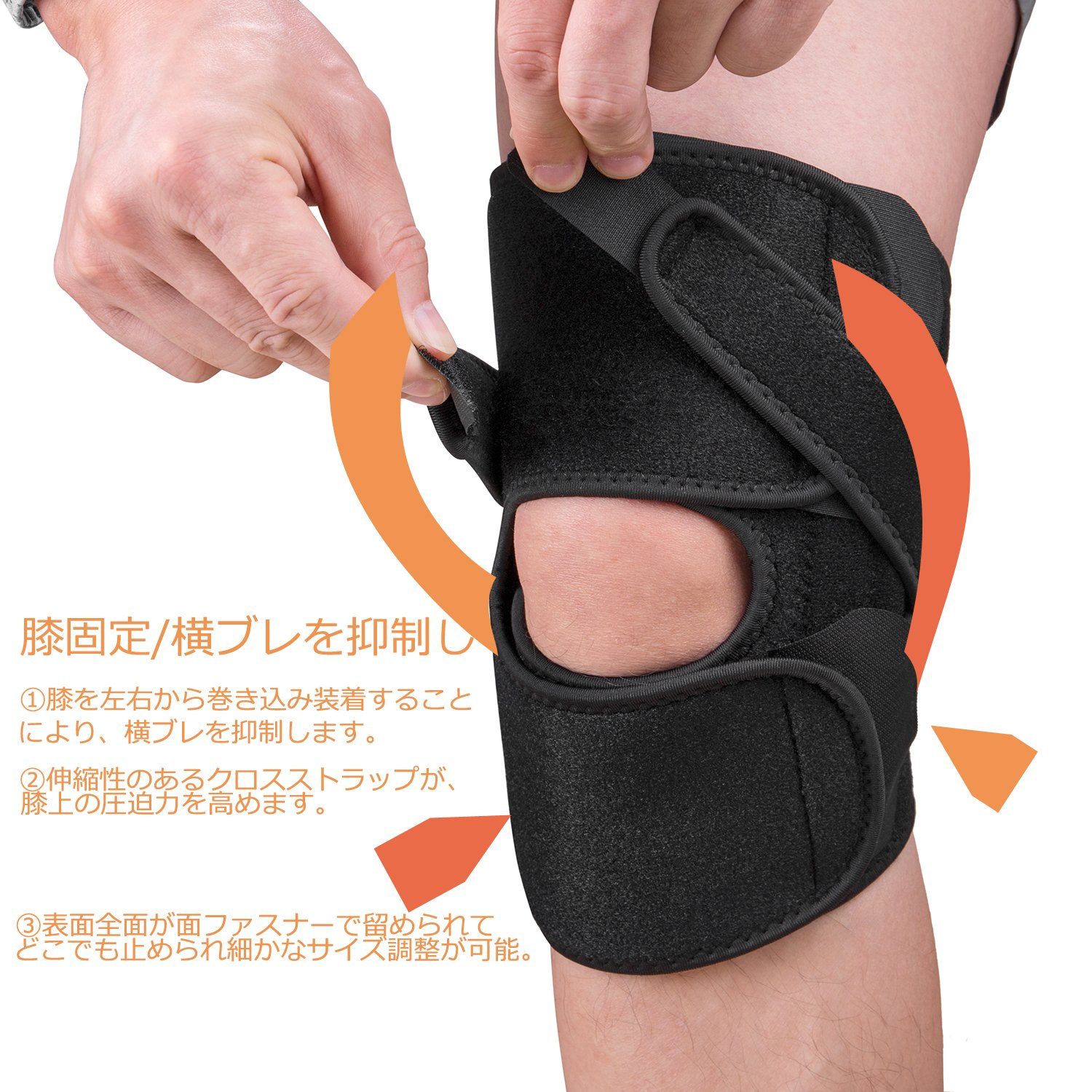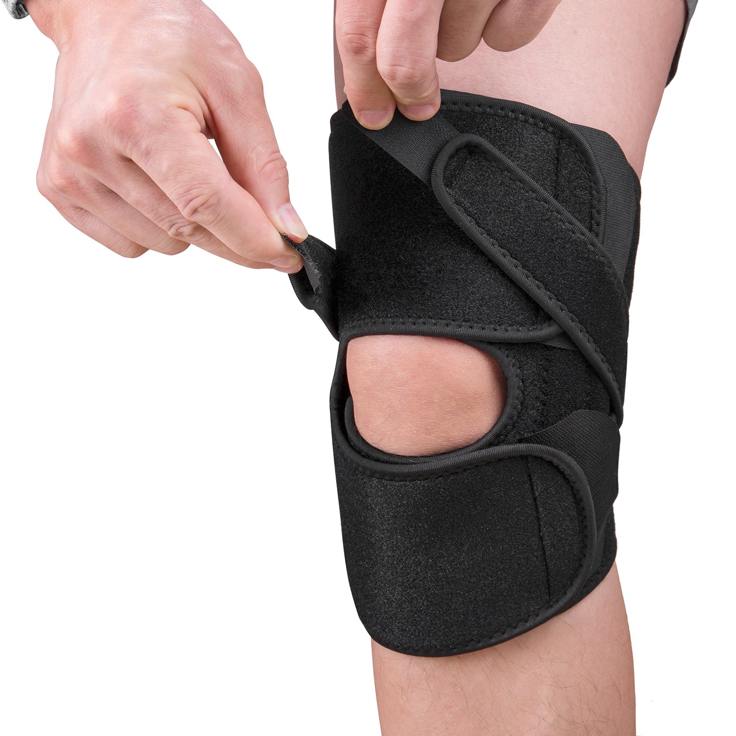 A stretchy cross strap increases the compressive force on the knee.