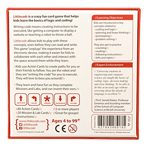 -. Binding : Toy -. Brand : Littlecodr -. EAN : 0627843466185 -. Edition : First Edition -. Feature : Card game for kids and kids at heart / Introduces coding and computer programming to anyone age 4 and up / Crowdfunded on Kickstarter -. IsAdultProduct : 0 -. Label : Littlecodr Games Inc. -. Manufacturer : Littlecodr Games Inc. -. MPN : CDR101A -. PackageQuantity : 1 -. PartNumber : CDR101A -. ProductGroup : Toy -. ProductTypeName : TOYS_AND_GAMES -. Publisher : Littlecodr Games Inc. -. Studio : Littlecodr Games Inc. -. Title : Littlecodr - Kids Coding Game -. UPC : 627843466185