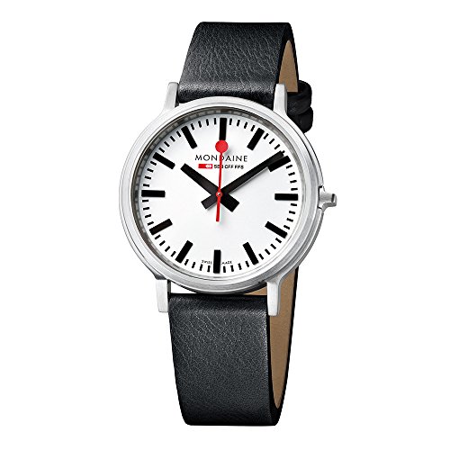 -. Feature : Mondaine Stop2go leather strap watch / Black hour markers, Black hour and minute hands / Swiss-quartz Movement / Case Diameter: 41mm / Water Resistant To 99 Feet