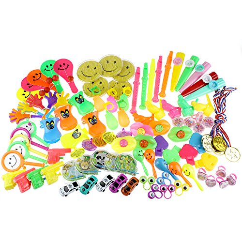Feature: 100 Pc toy assortment is packed with 100 assorted party favors toys that include 20 kinds of toys, rings, whistles, party noise maker, hand chapper, water gun, small cars and so on.