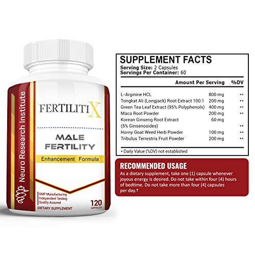 UNIQUE SCIENTIFICALLY BACKED NON-PROPRIETARY FORMULA TO IMPROVE SPERM COUNT, QUALITY, MOTILITY, AND VOLUME: FertiltiX formula utilizes a unique blend scientifically backed dosages of the best male fertility enhancers. Do not be fooled by blends that hide their cheap, ineffective, under dosed ingredient amounts within a proprietary blend. FertiltiX contains antioxidants, amino acids, and herbs that have been demonstrated to improve male reproductive health, including testosterone production, increasing a couples chances of conceiving a child. FertilitiX was designed to improve all measures of sperm health, giving you the best chance possible of conception. Spermatogenesis, the generation of new sperm, is a three-month process, so continue supplementation until pregnancy has been achieved. FertilitiX unique formula contains effective doses of L-Arginine HCL, Tongkat Ali (Longjack) Root Extract 100:1, Green Tea Leaf Extract (95 percent Polyphenols), Maca Root Powder, Korean Ginseng Root Extract (5 percent Ginsenosides), Horny Goat Weed Herb Powder, and Tribulus Terrestris Fruit Powder. We are so confident you will be blown away by FertilitiX that we will give you a full refund at any time if you are unsatisfied. Simply contact NRI directly and we will take care of the rest. You have got zero risk and nothing to lose, so purchase now with confidence.Feature