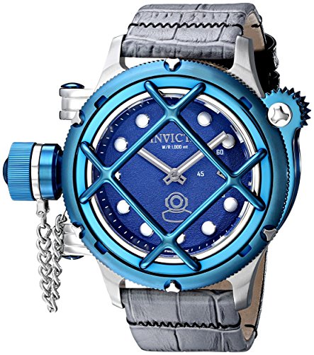 -. Feature : Precise 17 jewels mechanical Swiss made movement; 60 second sub dial / Blue dial with cage-like accent, silver tone and white hands and hour markers; luminous; blue ion-plated stainless steel bezel; crown with screw-down protective cap; hinged case back that opens; flame fusion crystal; stainless steel case; grey and black leather strap / Mechanical-hand-wind movement / Case diameter: 54mm / Water resistant to 3280 feet