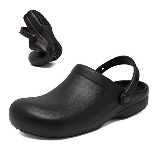 -. Feature : SLIP RESISTANT SOLES: Designed with slip resistant and durable rubber soles allow you walk around polished floor safely / STURDY ENCLOSED TOE CAP: Enclosed design and extra-dense EVA toe cap offer extra protection and with thicker metatarsal area protect your foot from hurts and kitchen spills / LIGHWEIGHT AND COMFY: The work clogs designed specifically for those who in the restaurant, food service, hospital,clinic and health care industries,Educators and support wear long hours on their foot / BREATHABLE INSOLE: Comfort, non slip , breathable and foot bed designed promised you wear comfy and keep dry / MULTIFUNCTIONAL CLOGS: Perfect for all occasions -- indoor home ,outdoor, medical, garden lake, kitchen, walking,clinic,hospital,beach,work wet place and others