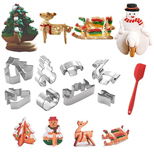 3D Christmas Cookie Cutters Set, Stainless Steel Food Grade Cake Mold DIY Biscuit Baking Tool, Including Snowman, Xmas Tree, Reindeer, Sleigh - 8pcs with 1pcs Silicone Spatula
