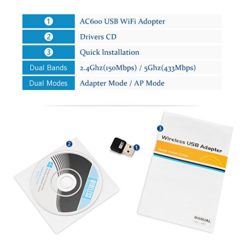 The AC600 WIFI Dual Band USB Adapter, with maximum speed up to 5GHz 433Mbps or 2.4GHz 150Mbps, delivers powerful wireless AC technology to your desktop or personal computer.Simply plug the adapter into an available USB port and connect to a wireless network to access a secure, high speed internet connection. It will provide better wireless performance with reducing WIFI interference to maximize the power for faster streaming, gaming and Skype calls.