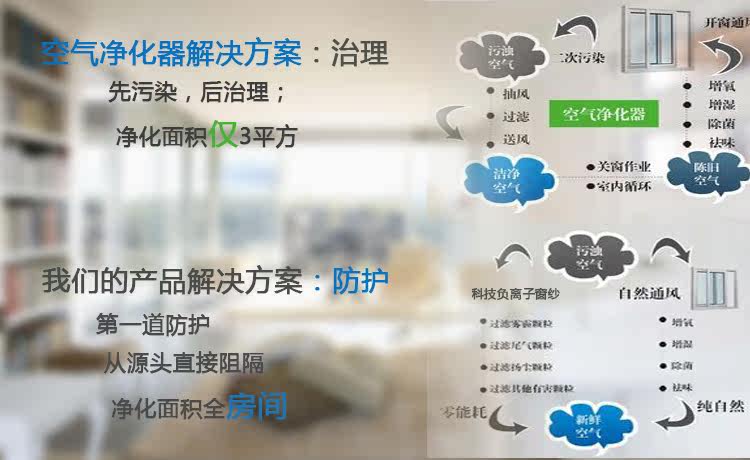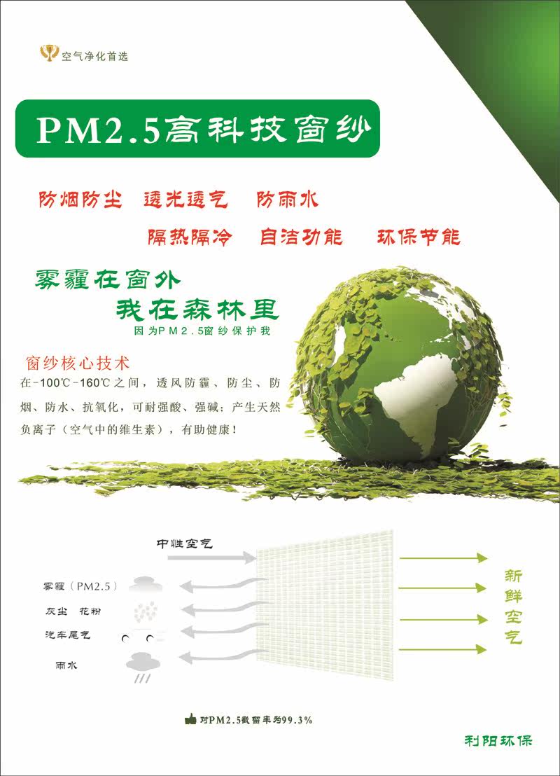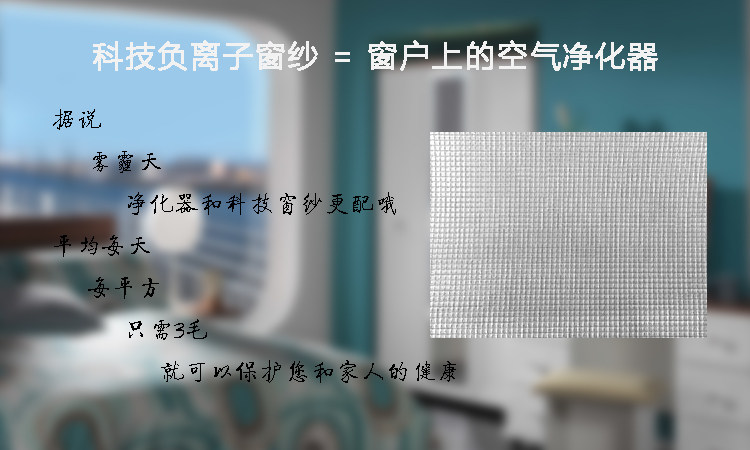 PM2.5 window screens, screens core technology, between -100C-160C, ventilation and anti-fog and haze / dustproof / smoke protection / water / antioxidant / can be resistant to acid / alkali / production of natural negative ion (air negative ion). contribute to health. No cleaning, dust off automatically. . / Low cost / low carbon / environmental / health / give children a healthy space, a healthy environment to the elderly.
