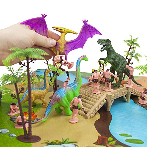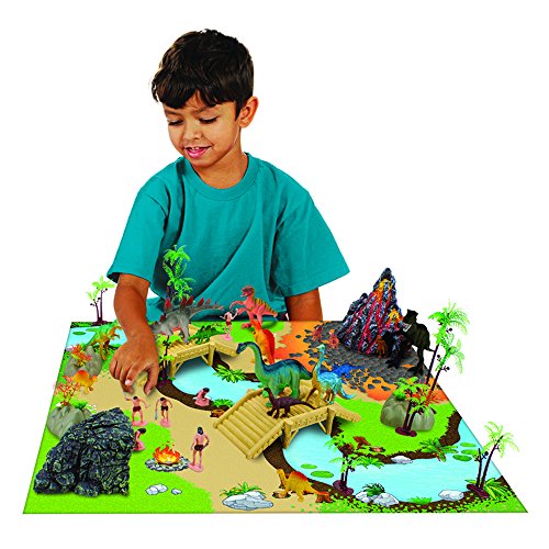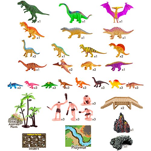 -. Feature : Over 40 dinosaurs from over a dozen species in countless sizes, shapes and colors, 12 cavemen, and a huge variety of structures and prehistoric foliage / Seek shelter from the active volcano in the sturdy cave, or cross the treacherous river safely using two wooden bridges / Includes a roomy, resilient 23" x 19" playmat peppered with small details to further encourage imaginative play. Will the cavemen and dinos be friends or foes? / Prehistoric Fun Facts insert is a great way to teach your kids about different species of dinosaurs and other prehistoric life / Comes in our new and improved heavy-duty storage container!