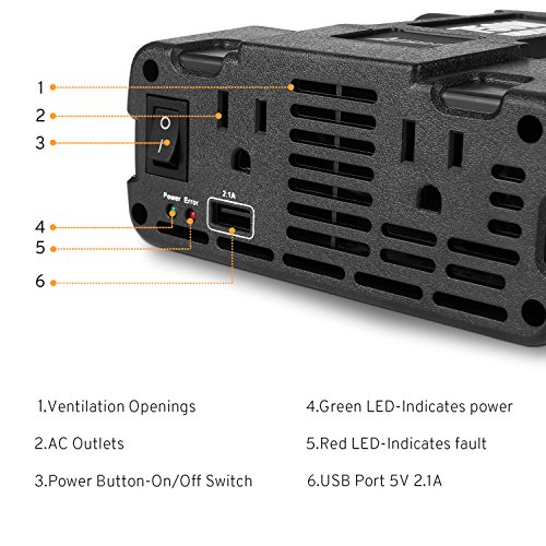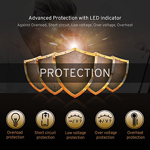 Built-in Cooling Fan & Protections with LED indicator & Audible Alarm: automatic shutdown protection against Over voltage / Low voltage / Overload / Short circuit / Over heat
