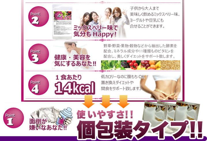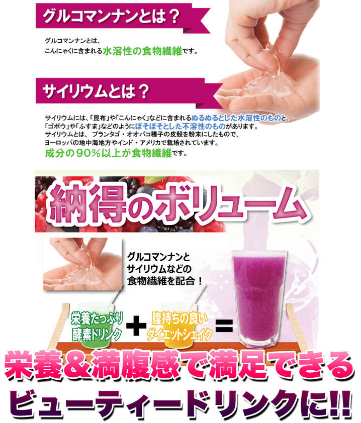 ●原材料名:水溶性食物繊維、ぶどう糖、アサイー果汁末、果実(ぶどう、オレンジ、りんご、バナナ、パインアップル、うんしゅうみかん、レモン、プルーン、はっさく、パッションフルーツ、マンゴー、もも、キウイフルーツ、アセロラ、カムカム、カシス、ざくろ、ブルーベリー、クランベリー、ラズベリー、ローズヒップ、いちご、ライチ、西洋なし、あんず、タンカン、デコポン、ライム、ゆず、うめ)、201種植物発酵エキス、サイリウムハスク、こんにゃく、増粘剤、甘味料(スクラロース)、天然着色料、クエン酸、香料、ビタミンC、ビタミンE、ナイアシン、パントテン酸Ca、ビタミンB1、ビタミンB2、ビタミンB6、ビタミンA、ビタミンD、ビタミンB12、葉酸 (原料の一部に、りんご、やまいも、を含みます。)
