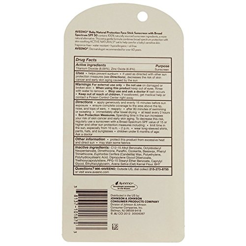 AVEENO Baby Continuous Protection Face Stick Sunscreen SPF 50, 0.5 oz (Pack of 2)