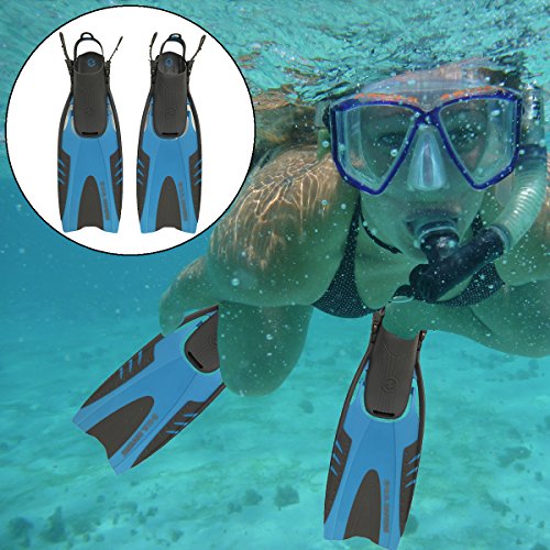 Dive in to adventure with these pivot-flex diving fins! You'll be swimming with the fishes all day in comfort with the adjustable gel padded strap and flexible fin. The full blade will give your dive the power to explore beneath the waves while helping you conserve energy. Whether scuba diving or snorkeling, these fins will take you further!
