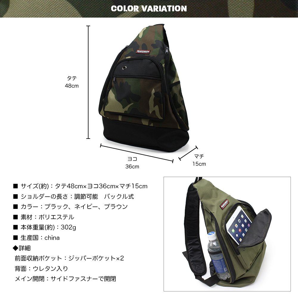 Mesh pocket into which 500 ml PET bottle enters on both sides, Vertical fastener pocket which folds umbrella on one side side, opening and closing of main storage becomes a fastener type from the side.