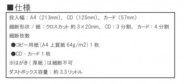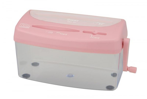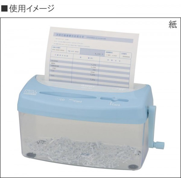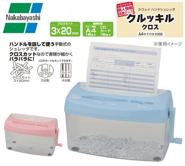 fk094igrjsokハンドルを回して使う手動式のシュレッダです。クロスカットなので書類が細かくバラバラになり、セキュリティが高い。 サイズ W293(340※使用時)×D144×H178mm 個装サイズ:32×16×19cm 重量 1.8kg 個装重量:2000g 素材・材質 本体:ABS ダストボックス:AS その他:スチール 製造国 中国 1台で3つの機能を搭載したシュレッダ。  ブルー   ピンク         ハンドルを回して使う手動式のシュレッダです。クロスカットなので書類が細かくバラバラになり、セキュリティが高い。 fk094igrjs