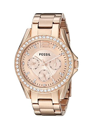 Our signature Riley style with a 45-stone topring, features a rose gold-tone finish and a textured rose dial. This Riley watch also features a multifunction movement. Case Size: 38mmCase Thickness: 11mmWater Resistant: Up to 10 ATMWarranty: 11-year limited Origin: ImportedView Size GuideFeature