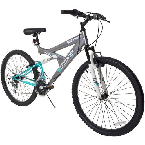 Studio : Ozone Publisher : Ozone Product Description You'll love riding around in the Ozone 500® Women's Ultra Shock 26" 21-Speed Dual-Suspension Bicycle. The 26" x 1.95" wheels and 26" x 1.5" alloy rims provide a comfortable ride, while front and rear V brakes ensure swift, reliable stopping and the Index 21S derailleur with a Shimano 21-speed grip shift provides fast, smooth shifting. Dual-suspension shock fork absorbs bumps. 0