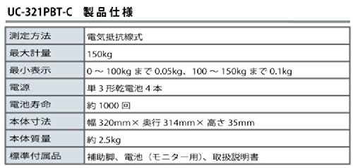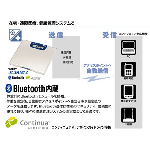 UC-321PBT-C 서는,콘티《뉴아》설계 가이드 라인 준거 Bluetooth내장 네트워크 대응 체중계. (체지방 등체 조성은 측정 할 수 없습니다.)체중을 측정 후,자동적으로 측정 일시나 측정치를 wireless 송신합니다.콘티《뉴아》규격 (Bluetooth HDP) 에 대응한 퍼스널 컴퓨터 등의 수신기기에 측정 데이터를 송신하고, 인터넷상의 건강관리 서비스에 데이터를 관리하는 것 를 할 수 있습니다.※본 제품은 iOS미 대응이 되어 있습니다.