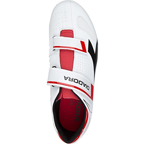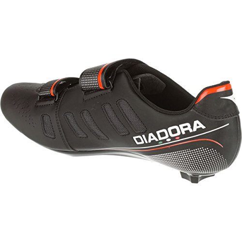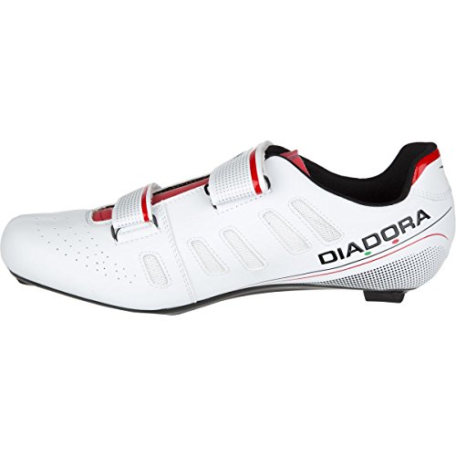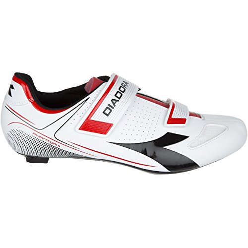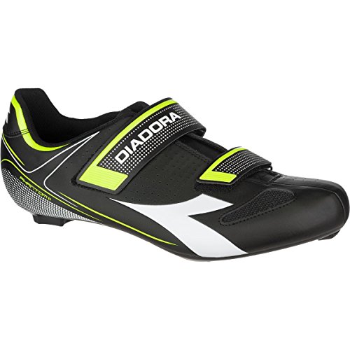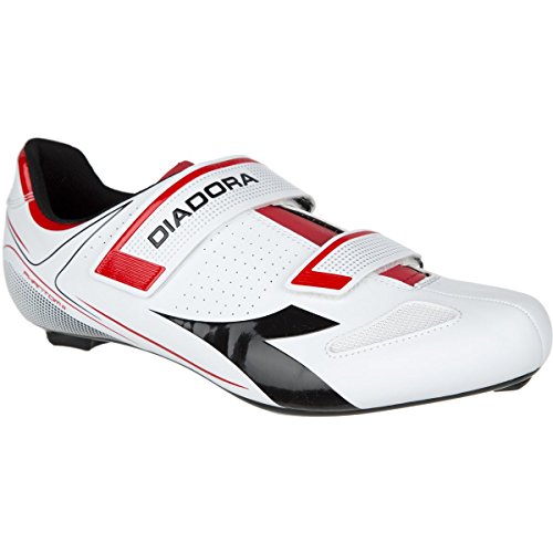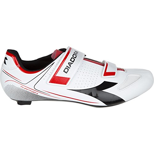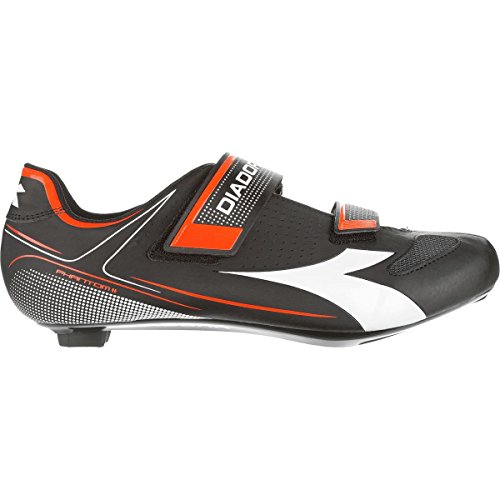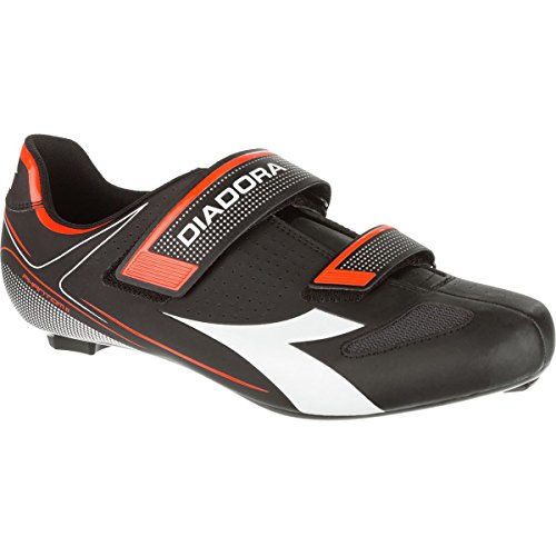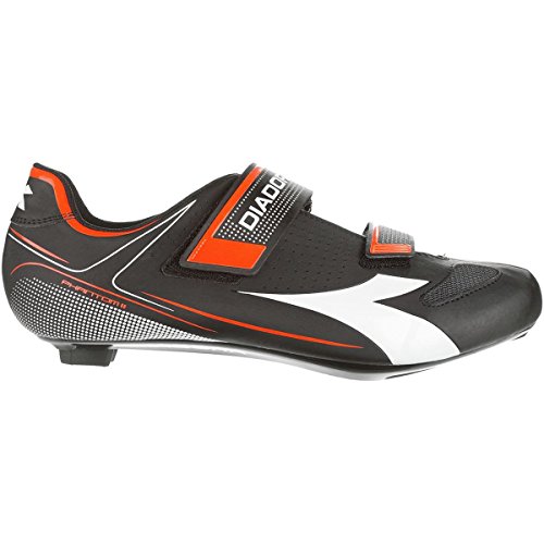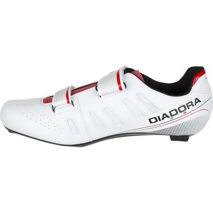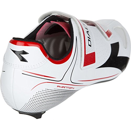 Studio : Diadora Publisher : Diadora Binding : Apparel Product Description Stepping up to clipless pedals and cycling shoes can be intimidating, especially if you're relatively new to cycling; however, if you're thinking about investing in your first pair, we recommend models like Diadora's Phantom II Men's Shoes. With a forgiving price and trickle-down technology from Diadora's impressive lineup of pro shoes, the Phantom II's will allow you to trade-in those worn out trainers and enjoy the vastly improved power transfer and comfort that a well-fitting pair of cycling shoes can provide. We like that Diadora constructs the Phantom II on its Race Plus last. Its roomier fit dispels the assumption that all cycling shoes are tight and constricting while allowing for extra layering in the cold months. For cyclists with a slightly wider forefoot or newer riders who don't want a confining shoe, the Race Plus last keeps the Phantom II secure on your foot without the aggressive, metatarsal-squeezing cut of a race shoe. Diadora's supportive Suprell-Mesh upper wraps the tops of the feet and includes perforations and mesh paneling to allow for ample airflow. In the notoriously difficult heel area of the shoe, Diadora adds its shaped heel cup to address slippage and allow for efficient power transfer throughout your pedal stroke. Also contributing to efficient power transfer, Diadora's Sport Road CR outsoles rely on composite-reinforced nylon to provide responsive stiffness as you spin the pedals. The shoes are finished with two hook-and-loop straps to achieve a secure, not constricting, fit. 0