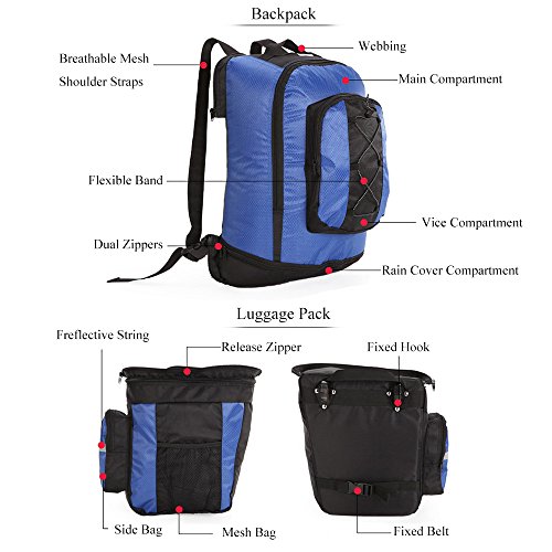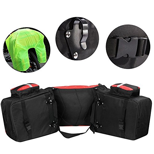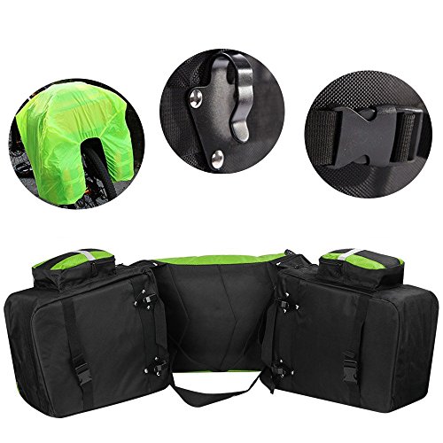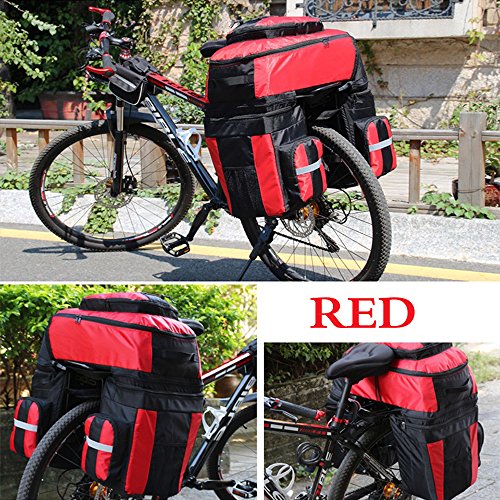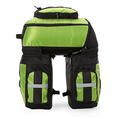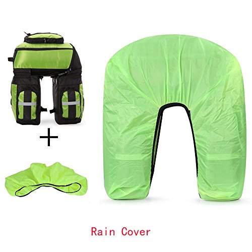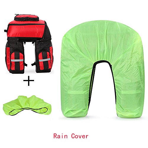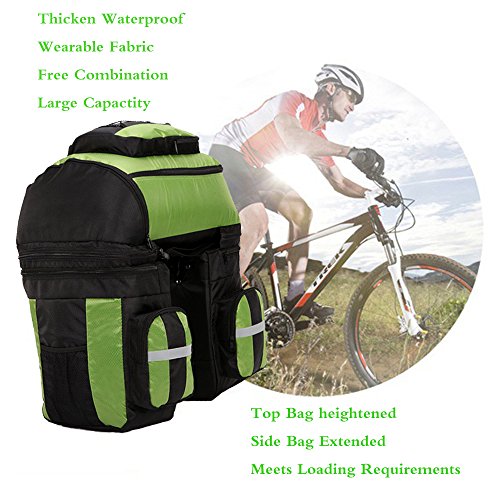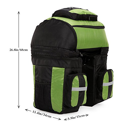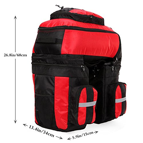 Product Description Ravifun Extra Large Bike Pannier Bag 70 L Bicycle Rack Trunk Bag Rear Seat Saddle Bag? Feature: Material: 1680D tear resistance Nylon, double waterproof coated fabric. ABS buckles. 3 in 1: Detachable, Can be separated to 1 backpack and 2 hand-carry bags. Color: Blue/ Green/ Red. Net Weight : 1.95 KG/ 4.3 LB. Type: Panniers Rack Trunk. Capacity: 70 L (2.5 cu.ft). Apply for: MTB and all other bicycle. Gender: Unisex Suitable for: Long journey rides in changeable weather and complex terrain, hiking, climbing, ?traveling and so on.. Stylish and classic design, exquisite appearance. Water-resistant, wear-resistant, high tear-resistance.? With magic tapes to fasten, it is easy to adjust and mount in the bicycle frame with sturdy hooks and ABS buckles, no sway. Simple to disassemble.? 3 cm wide reflective strips design to ensure safe cycling. Detachable shoulder straps; Strong hooks; Comes with rain cover, super waterproof. Size: Top Bag: 18.5*11.8*9 inch (H*L*W). Side Bags: 13.4*6*11.8 inch (H*L*W) . Load limitation of each bag: Less Than 22 LB (10 KG). Overload might cause the stitching falling apart. Package includes: 1 * 3 in 1 Rear Bicycle Bag. 1 * Rain Cover. We believe quality is what counts most, so we promise you a fully charge refund if you have any issue about the quality of our item. Have a nice shopping day.