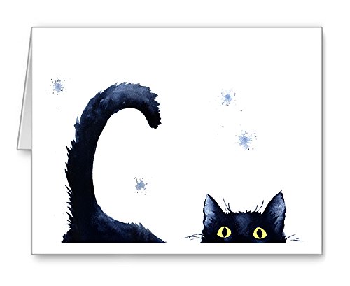 -. Feature : "Sneaky Black Cat" artwork by watercolor artist DJ Rogers. / Note card size is 4.25 x 5.5 inches / Set of 10 note cards with matching white envelopes. / Note cards are blank inside for your personal message. / Suitable for framing.