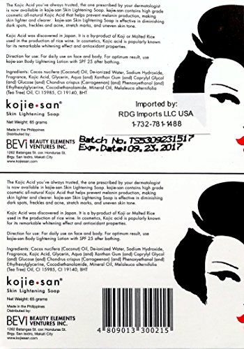 Studio : Kojie San Publisher : Kojie San Binding : Health and Beauty Product Description INGREDIENTS: Cocos nucifera (Coconut) Oil, De-ionized Water, Sodium Hydroxide, Fragrance, Kojic Acid, Glycerin, Aqua (and) Xanthan Gum (and) Caprylyl Glycol (and) Glucose (and) Chondrus crispus (Carrageenan) (and) Phenoxyethanol (and) Ethylhexylglycerine, Cocodiethanolamide, Mineral Oil, Melaleuca alternifolia (Tea Tree) Oil, Cl 15985, Cl 19140, BHT HOW TO USE: Lather soap and apply to treatment areas. Leave the soap on for up to 30 seconds. Apply once per day and increase to twice a day if well tolerated. If dryness occurs follow with a moisturizing cream. ONLY THE LARGE SIZE 135G BAR HAS THE KOJIC ACID STAMP, THE 100G AND 65G DO NOT. 0