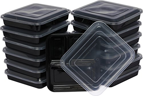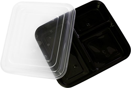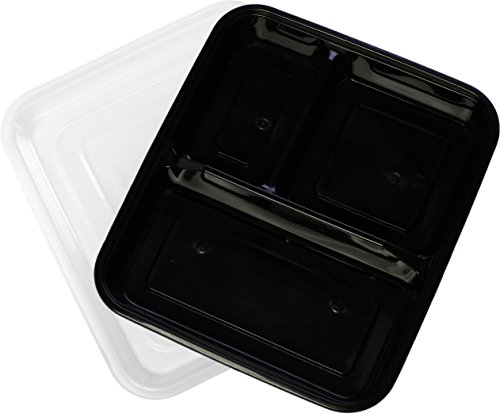 Table To Go 50-Pack 32 Ounce Three Compartment Bento Lunch Boxes with Lids - Stackable, Reusable, Microwave, Dishwasher & Freezer Safe - Meal Prep, Portion Control, Black