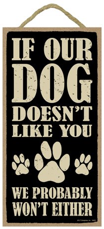 (SJT94402) If our dog doesn't like you, we probably won't either 5" x 10" primitive wood plaque, sign