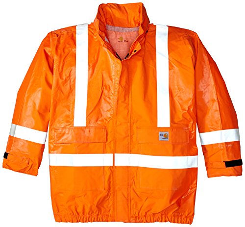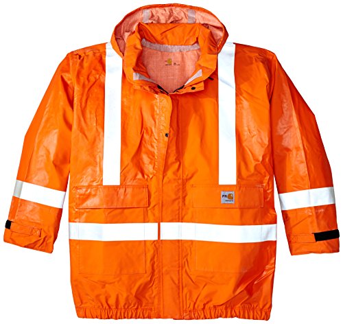 Studio : Carhartt Sportswear - Mens Publisher : Carhartt Sportswear - Mens Binding : Apparel Product Description This easy-wearing, hard-working FR rain jacket is up for any job. It features 12-ounce Nomex IIIA fabric with a FR neoprene moisture barrier. Rainproof with an attached hood you can stow away, it also has two front-patch pockets, a lanyard pass-through for safety harness compatibility, and an elastic inner storm cuff with hook-and-loop adjustments. It features 3M Scotch lite Reflective Material and has 2-inch reflective trim. Meets ASTM F1891, F2733, F903, and NFPA 70 E requirements. CSA Z96 for Canada. 12-ounce Nomex IIIA fabric FR neoprene moisture barrier Meets ASTM F1891, F2733, F903, and NFPA 70 E requirements 0