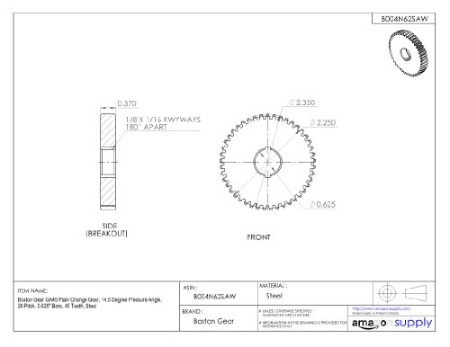 Boston Gear GA45 Plain Change Gear, 14.5 Degree Pressure Angle, 20 Pitch, 0.625" Bore, 45 Teeth, Steel