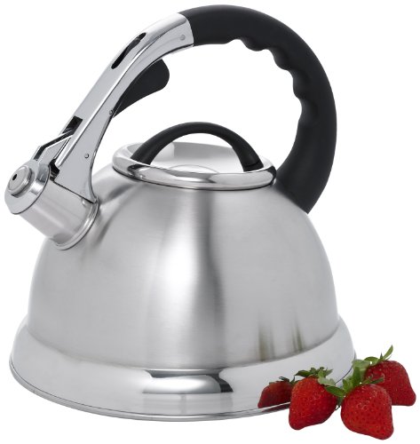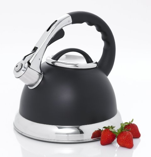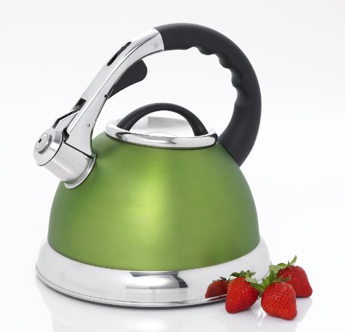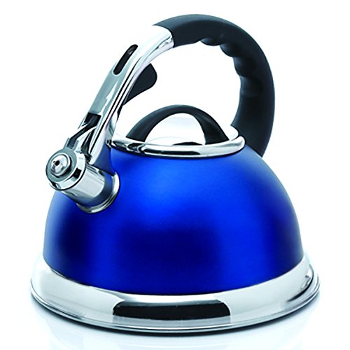 Creative home camille 3.0 quart opaque blue stainless steel tea kettle. heavy gauge aluminum capsulated bottom allows for even heat distribution. polish stainless steel accents on the bottom and lid. stay cool handle with a one touch feature for pouring. whistling spout notifies you when water is boiling.Feature
