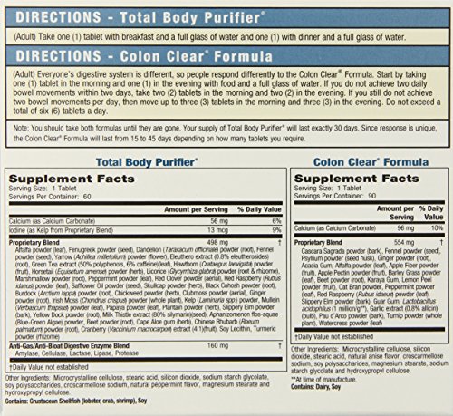 -. Feature : Flatter Abdomen, Less Bloating , Feel Energized , Feel Clean Inside / Contains Anti-Gas/Anti-Bloat Enzymes / Bottle One: Total Body Purifier 60 Tablets / Bottle Two: Colon Clear 90 Tablets