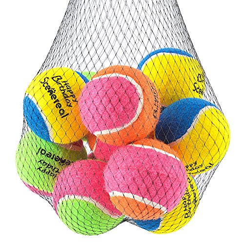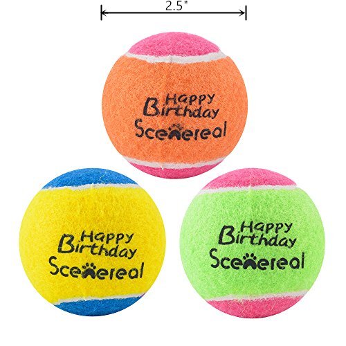 INTRODUCTION: -Unlike a ordinary smooth tennis ball, its rough shape and texture causes the ball to bounce erratically. -Our Tennis Balls are made from non-toxic materials, non-abrasive felt. -You can do interactive games with your dog to improve his brain thinking, to train your dog to be smarter. -Squeaky design increases more fun for playing games. -SCENEREAL Tennis Balls are imprinted with a Happy Birthday" logo and come 12 to a package, to give your furry friend a big surpprise!