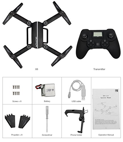 Studio : MANZOKU Publisher : MANZOKU Binding : Toy Product Description Drone RC Quadcopter with Camera Live Video, Altitude Hold Headless Mode 3D 360 Degree FPV VIDEO WIFI 720P HD Camera 6 axis 4CH 2.4Ghz Easy Fly Steady Drones for kids Beginner Aldults RTF Innoclan mini drone foldable with camera is suitable for beginners, equipped with 6-Axis gyro and altitude hold function. Even if you release the throttle stick, the drone will not fly upward. Besides, with wifi function can be connected APP, we can take pictures, videos, real-time transmission through the phone camera image. Features: 1.With foldable arm, small size, easy to carry. 2.3D flips with amazing agility provides a stunt aerial show. 3.Built-in barometer with altitude hold function provides stable flight. 4.It has 6-axis gyro which can have more stable flying and be easy to control. 5.Track-controlled mode: draw the flight track as you wish on the smart phone. 6.The G-sensor mode enables the small quadcopter to automatically follow the way you move your smartphone. 7.Can be easily controlled by one key to take off or landing, more convenient and quick. Specifications: Drone Size: 25 x 6.7 x 17.3 CM Drone Weight: 130 G Drone Battery:2* 650mAh Li-po battery (included) Controller Battery: 2×1.5V AA battery (not included) ChargingTime: about 60 minutes (USB Charging) Flying Time: about 10 minutes Control Distance: About 150 M Support System: iOS Android Real-time Shooting: Yes Headless Mode: Yes FAQ of the aircraft: 1. One or more motors don't work. When binding, drone on flat surface, or motor damaged. 2. The aircraft is out of balance (can't fly, deviation, spinning on the ground). Check the propellers is installed in the right way.