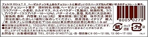 原材料:砂糖、ヘーゼルナッツ、植物油脂、ココアバター、カカオマス、小麦粉、ホエイパウダー、脱脂粉乳、ココアパウダー、バターオイル、 食塩、乳化剤、膨張剤、香料