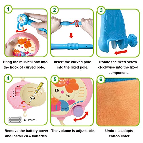 - 【Easy to Assembly】:1 * Musical box, 1 * bed bell umbrella, 1 * curved pole, 1 * fixed pole, 5 * stuffed toys, 1 * user manual.Easy to follow assembly instructions are included. Safely fits all standard cribs