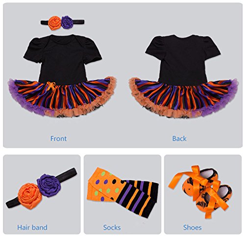 -. Feature : Package Included: 1*dress; 1*Headband; 1*leg warmers; 1 pair shoes; / bodysuit in "My 1st Halloween" desig, Baby girls lovely romper, has short sleeves and snaps at the bottom / Material:Cotton, Machine wash or hand / Dress lace fabric is very soft for baby / Suitable for Halloween, birthday party, photo prop, holiday or play wear.